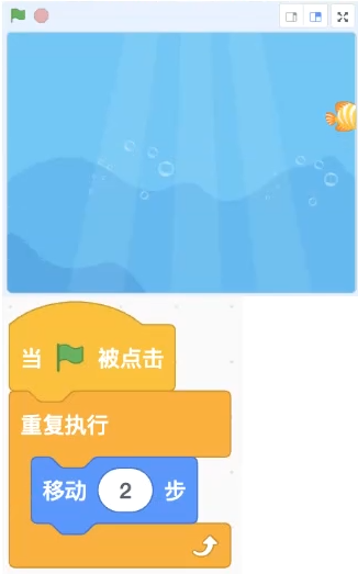 点击小绿旗之后,小鱼一直向前游,但是游到了舞台边缘时卡住了,加上选项中哪个积木块可以解决这个问题,让小鱼可以一直在舞台中游动?