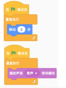 小女孩的程序如图,点击小绿旗后,她会先移动再播放歌声。
