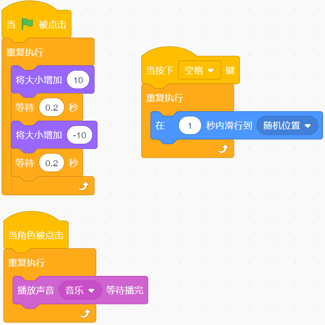 点击小绿旗5秒后,按下空格键,此时舞台上的角色有什么变化?( )