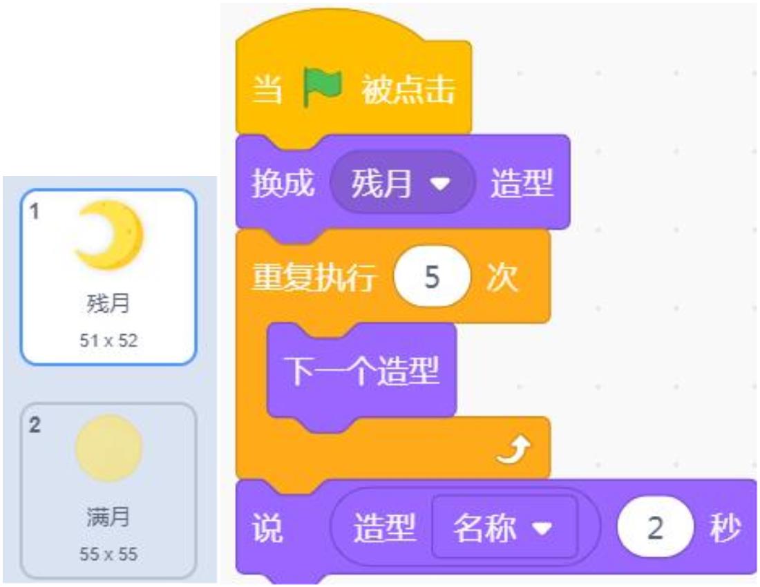 月亮有2个造型。运行下列程序,角色会说出“满月”。
