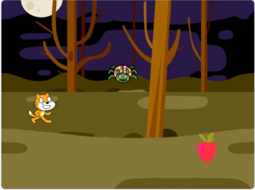 (1)小猫、蜿蛛、草莓的大小为60,三个角色的初始位置如下图所示;