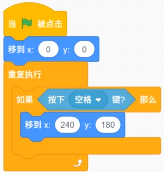 默认小猫角色,运行下列程序后,按下空格键,小猫会移到舞台右下角。