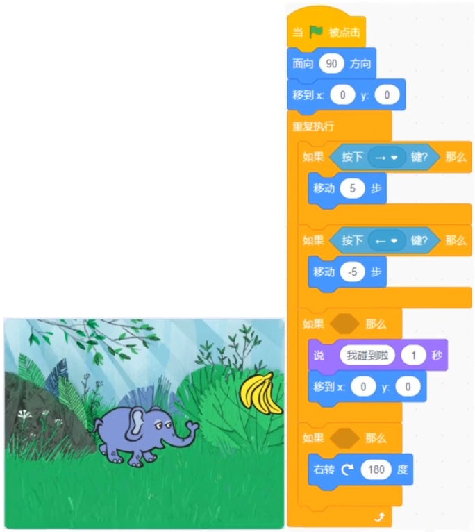 大象能左右移动,碰到香蕉会说“我碰到啦”,碰到边缘能反弹,程序空白处应依次填入的积木是?