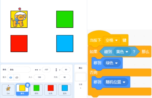 下列积木只能侦测是否碰到了背景上的某个颜色,不能侦测是否碰到了角色身上的某个颜色。