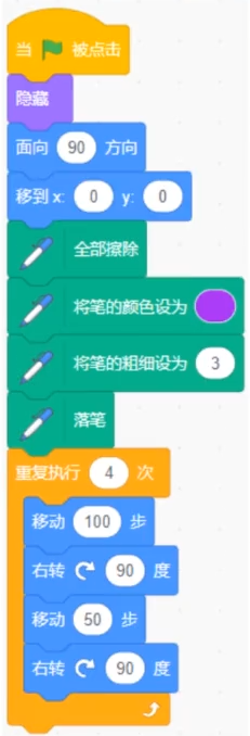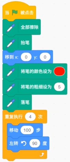 默认小猫角色,运行下列程序,舞台上能看到一个正方形。