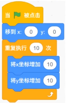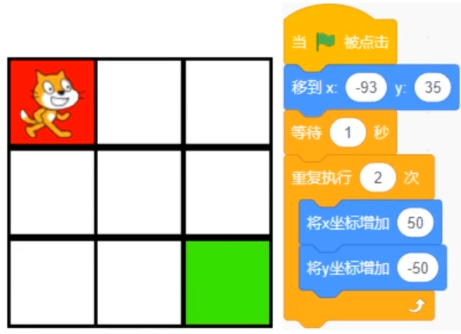 小猫角色初始位置在红色方格处,坐标为(-93,35),每个方格的边长为50,运行下列程序后,小猫最后移动到绿色方格处。
