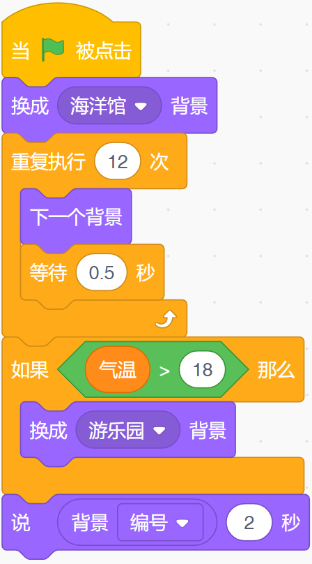 春游有4个目的地,今天的天气温度12°C,运行下面的程序,最终角色说出的内容是?